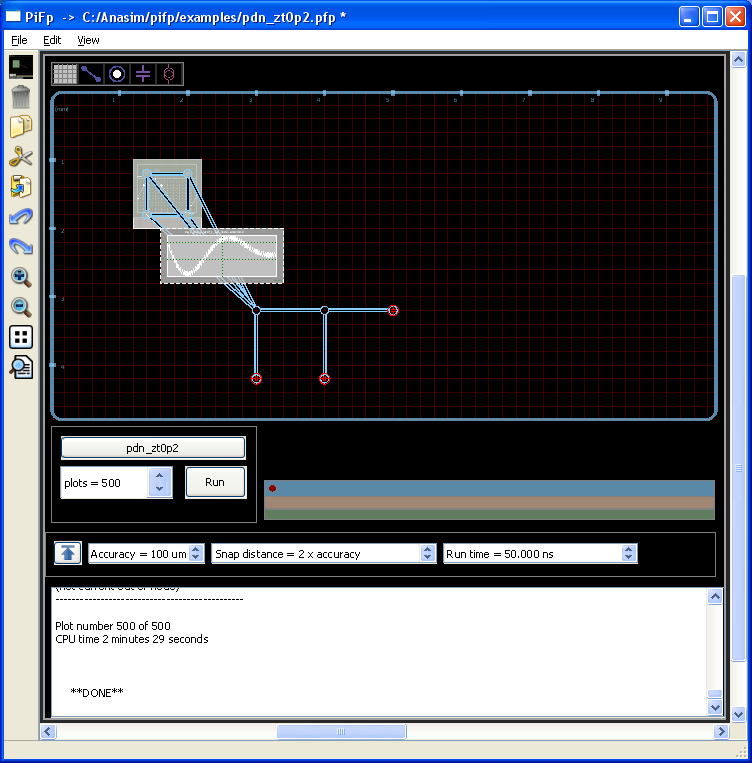 Example of a chip, package, and board PDN stack simulation (50ns) in PI-FP displaying a system resonance.